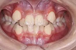 4、覆合過深:圖4 所示上前牙嚴(yán)重舌向傾斜,就是內(nèi)傾,當(dāng)上下頜牙齒咬合在一起時(shí),上牙將下牙完全蓋住,其美觀效果很差。如圖4所示.